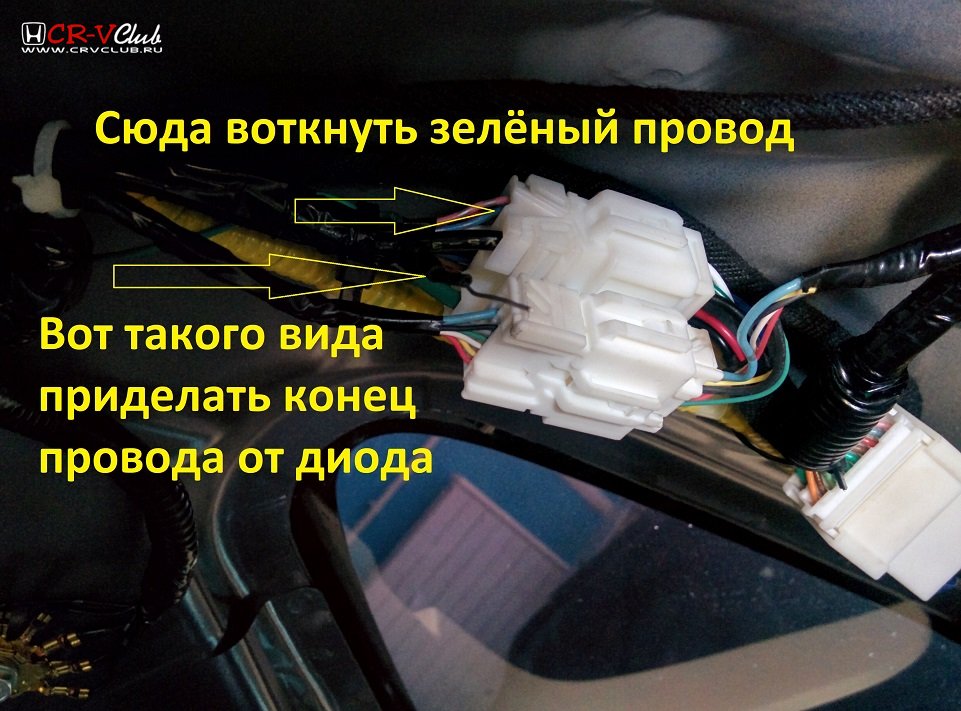 И ещё, в инструкции указывают, что нужно тянуть зелёный провод через всю магистраль к штатной кнопке открывания багажника. Я нашел этот контакт в разъёме слева вверху под левой светлой обшивкой отсека багажника. Взял от нового диода проводник (не оч. тонкий и не оч. толстый) примерно 1,5-2 см и засунул со стороны проводников ответной части фишки, направленные в сторону салона.