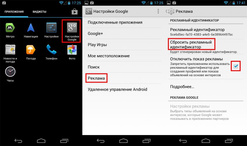 Если у вас одна из последних прошивок, то помимо стандартных настроек вы увидите новый значок — "Настройки Google". Откройте его и выберите "Реклама". На следующем экране сбросьте свой рекламный идентификатор и поставьте галку рядом с "Отключить показ рекламы".