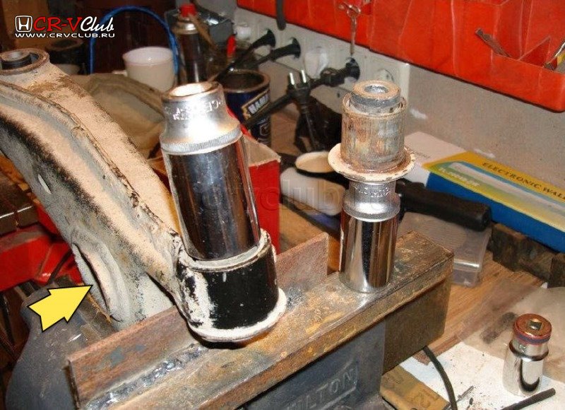 Бочонки. Очистив кордщеткой края посадочных гнезд, удаляем сайлент-блоки под вилку амортизатора, (которая была изготовлена из головки No32) с помощью оправки диаметром 40.5мм. Бочонки очень капризные, их внешняя обойма тонкая, поэтому нужно наставить оправку ровно, без перекосов. Не важно, чем кто пользуется, кувалдой, прессом, или винтом с чашками. Как процесс будет начат, так и окончен. На половине пути, первая оправка, может быть заменена, другой, диаметром 39,5. Это исключит её клин внутри гнезда. Говоря по-русски, разница в 1мм имеет огромное значение.