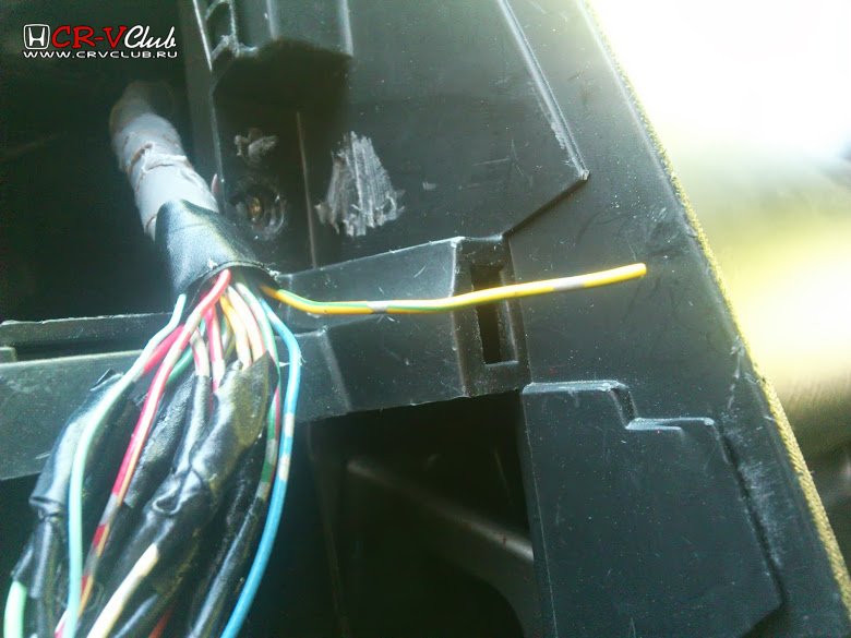 Снимаем бардачок и тогда открывается вид на штекера. Смотрим по правой стороне. Там стоит переходная муфта на сигнал и штекер с переходом кабеля на жёлтый с зелёной полоской и серыми точками. Теперь понятно, почему не мог его найти.