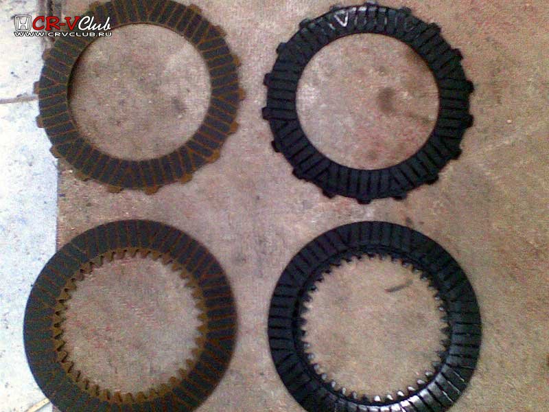Диски на одной стороне имеют фрикционные накладки, на другой стороне гладкие. Хорошо видно где диски из "пострадавшего" участка пакета. Перегретые диски чёрные, фрикционные наклейки почти стёрты, с гладкой стороны диски имеют тёмно синеватые разводы, что свидетельствует об очень высокой температуре.