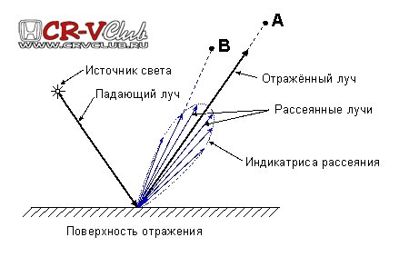 Причина кроется в свойствах отражателей. Любая практическая отражательная поверхность (стеклянное зеркало, отполированный металл, алюминированный пластик, хромированная сталь и т.д.) не является идеальной. Она не только отражает падающие на неё лучи света, но часть их поглощает, часть пропускает, а часть рассеивает. Вот та часть, которая рассеивается, и не даёт нам спокойно жить. Поверхности принято характеризовать коэффициентами зеркального и так называемого диффузного отражений. На рисунке ниже схематически показано, как отражается луч от гладкой поверхности. Помимо основного, зеркально отражённого луча, попадающего в точку наблюдения A, имеются также диффузно отражённые, рассеянные лучи, попадающие, например, в точку наблюдения B. Если поверхность была бы идеально гладкой, то она отражала бы только зеркальным образом, и лучей, попадающих в точку B, не наблюдалось бы совсем. К сожалению, даже самым лучшим образом отполированные зеркала рассеивают (т.е. диффузно отражают) десятые доли процента падающего света. Технология изготовления отражателей, применяемых в автомобильных фарах, стадии полировки не предусматривает совсем, и с помощью неё можно достичь коэффициента диффузного отражения в лучшем случае не более пары процентов.