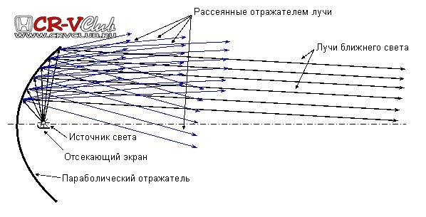 Теперь рассмотрим типовую конструкцию рефлекторной фары с параболическим отражателем. На рисунке схематически изображён принцип работы такой фары в режиме ближнего света. Лучи, исходящие из источника света, расположенного в фокусе параболического рефлектора, после отражения формируют пучок ближнего света, который направлен под небольшим наклоном вниз, обеспечивая необходимое положение светотеневой границы.