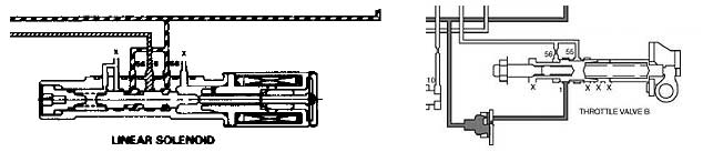 Давайте вернёмся к моменту переключения передач:  что бы перейти с одной передачи на другую гидравлической системе нужно стравить давление с цилиндра фрикционов одной передачи и подать давление в цилиндр другой. Казалось бы, чего тут сложного? Сложное в том, что в отличие от механической КП, где в момент переключения сцепление отсоединяет двигатель от трансмиссии,  тут переключения происходят под нагрузкой. Поэтому что бы переключения происходили без рывков и перегазовок нужна синхронизация процесса переключения. Логично было бы синхронизировать начало включения следующей передачи по падению давления в цилиндре предыдущей передачи до некоего порогового значения. Вот тут и возникают сложности: переключения могут происходить на разных скоростях, давление в системе непостоянно (оно зависит от нагрузки на трансмиссию) отсюда и скорость перемещения поршня разная... Значит необходимо смещать порог начала включения следующей передачи в зависимости от условий движения и "пожеланий" водителя. Именно для этого и предназначены "клапан дросселя" (trottle valve) в тросиковой коробке и линейный соленоид (linear solenoid) в "бестросиковых".  Вот они на рисунке "вырезаны" из гидравлических схем: